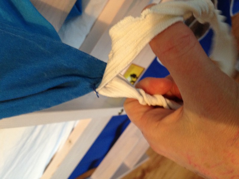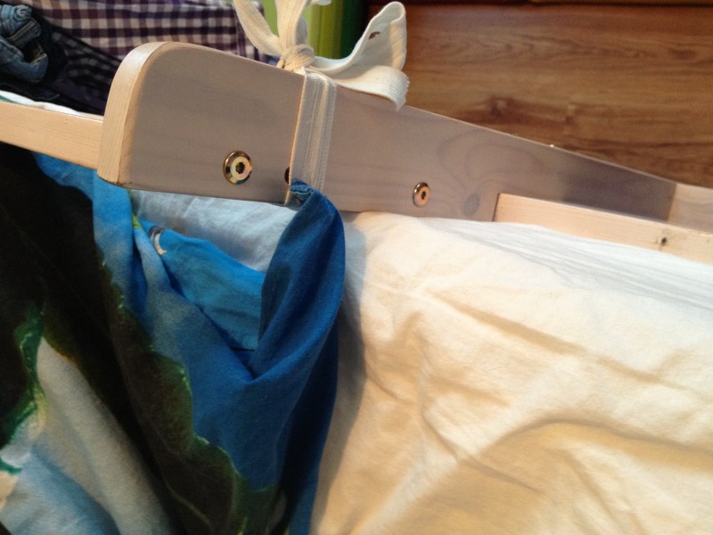 D'autres part, il ne bouge pas beaucoup mais arrivait quand même à se découvrir et nous appelait car il avait froid. Alors j'ai cousu de larges élastiques en haut de sa couette que je noue au lit une fois qu'il est dedans et depuis il ne